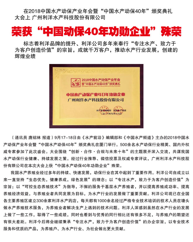 利洋公司荣获“中国动保40年功勋企业”殊荣