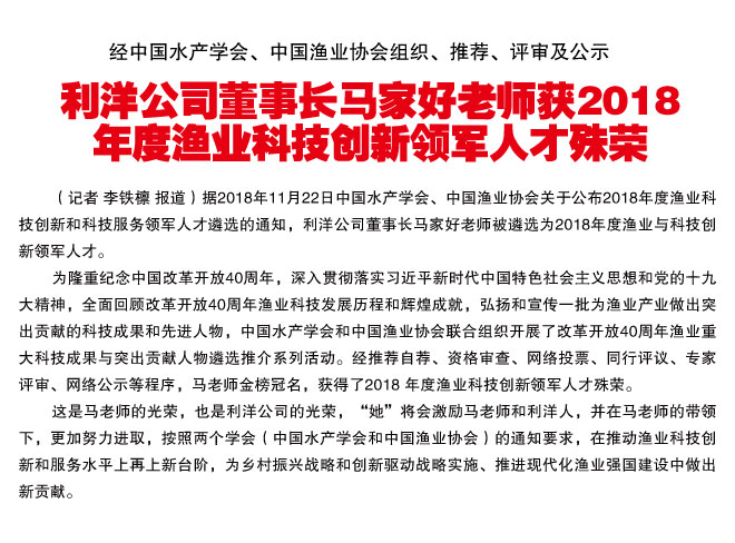 利洋公司董事长马家好老师获2018年度渔业科技创新领军人才殊荣