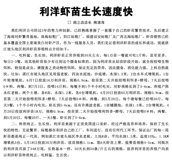 利洋虾苗生长速度快