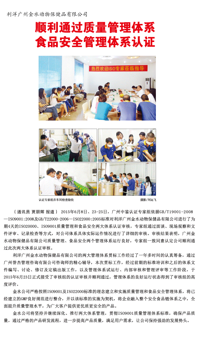 利洋广州金水动物保健品有限公司顺利通过质量管理体系食品安全管理体系认证