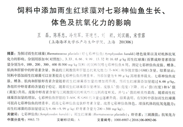 饲料中添加雨生红球藻对七彩神仙鱼生长、体色及抗氧化力的影响