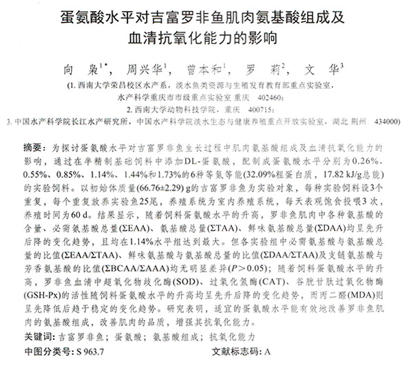 蛋氨酸水平对吉富罗非鱼肌肉氨基酸组成及血清抗氧化能力的影响