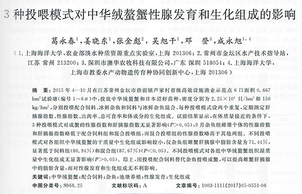 3种投喂模式对中华绒螯蟹性腺发育和生化组成的影响