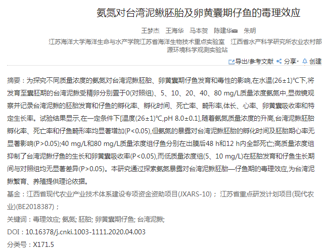 氨氮对台湾泥鳅胚胎及卵黄囊期仔鱼的毒理效应